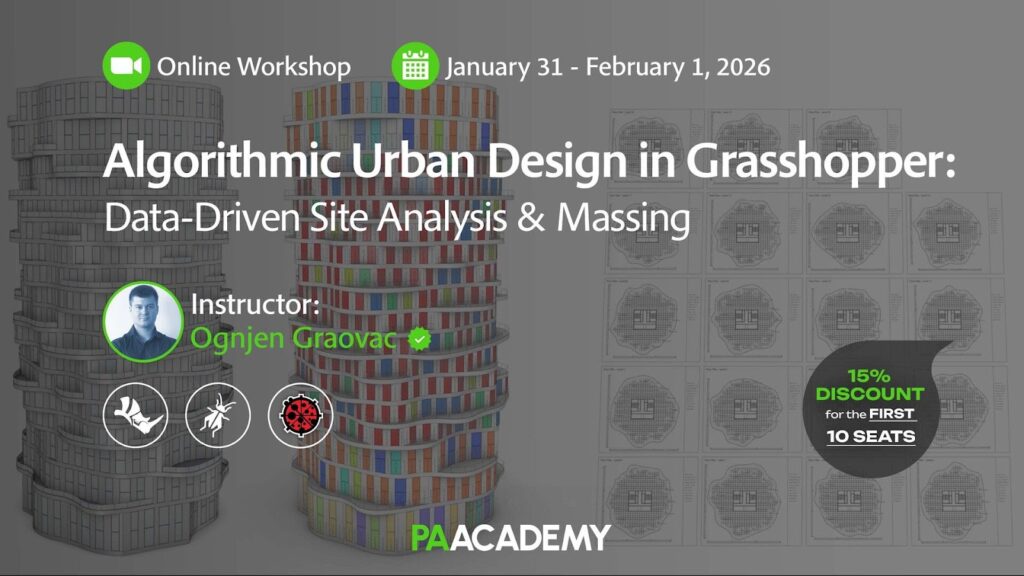📚 您将学习如何进行四项关键场地分析:日照、地形坡度、植被密度和可视性,并将原始数据转化为清晰的视觉图解。这些分析结果将作为生成式设计工作流的输入,用于推敲最佳建筑位置与体量。整个流程将在 Rhino 的 Grasshopper 中逐步构建,为您提供适用于任何场景的早期城市设计实用策略。