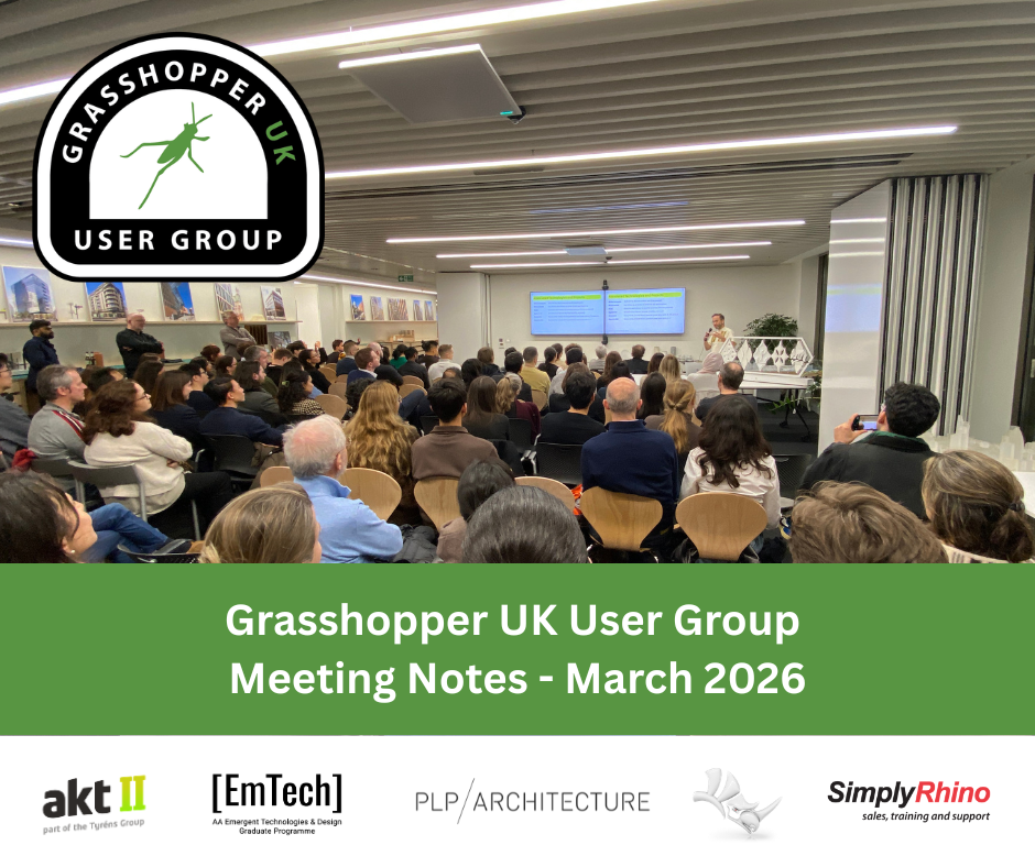 Simply Rhino 发布了近期在伦敦 PLP Architecture 公司举行的英国Grasshopper用户组会议的会议纪要,该会议于3月17日举办。如果您想了解以下演讲者的分享内容:PLP Architecture、AA建筑联盟的 Milad Showkatbakhsh、AKT II 工程公司,以及 McNeel 公司的 Luis Fraguada(他带来了关于 Rhino.Compute 支持 Linux 的激动人心的消息),那么您可以阅读 Simply Rhino 团队撰写的完整技术记录。