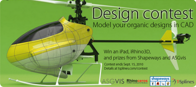 距离投稿截止日期 (2010年9月15日) 就剩三个星期了,现在开始用 T-Splines 设计还来得及! 加参这项 T-Splines 设计竞赛,设计与众不同的模型,可以提高您的知名度,并有机会赢得 iPad、iRhino 3D 及其它奖品。