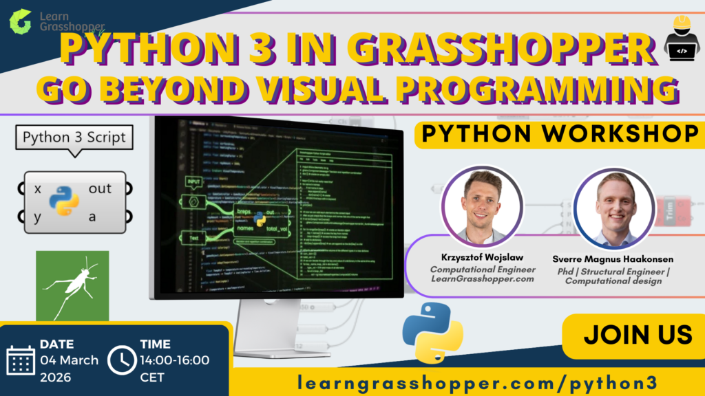 🔥 本次研讨会由LearnGrasshopper.com的Kris Wojsław与计算设计专家Sverre Magnus Haakonsen博士共同带领,展示如何通过Rhino 8的Python 3环境让你的Grasshopper工作更轻松、高效且灵活。你将学习如何导入实用程序库、用简洁脚本替代繁琐的组件群组,并以安全实用的方式运用AI工具。
