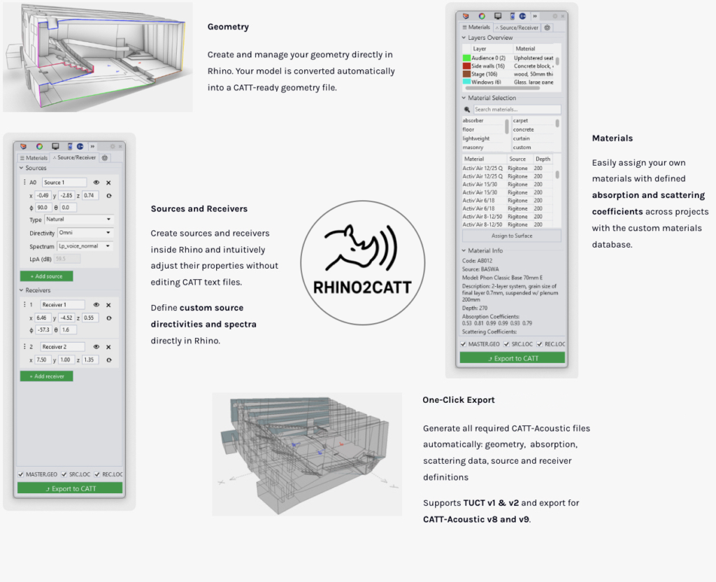 🔨 主要功能包括:带顶点优化的自动几何导出、自定义材料库,以及用于声源的自定义指向性和频谱数据库。一键即可将模型导出为 CATT 就绪文件(.geo, .loc),实现极其高效的从 Rhino 到 CATT 的工作流程。通过 Rhino.Inside.Revit,同样支持基于 BIM 的工作流,确保建筑设计和声学建模过程之间的顺畅协作。