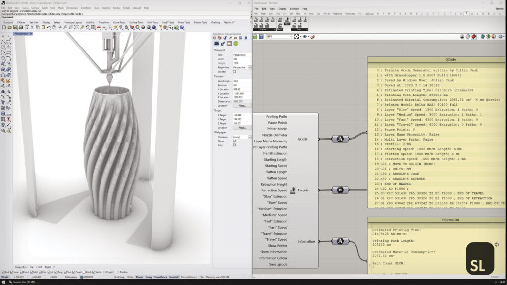 Termite在”主要”、”创建”、”排序”、”显示”和”示例”五个类别下提供了20个模块化组件,支持初学者和高级工作流程。它旨在成为Grasshopper新手的易用工具,安装后即可使用,同时其开放的模块化结构也为实验性制造提供了最大的自由度。用户可以在Rhino、Grasshopper中或通过Termite自带的组件设计打印路径,所有必需的G代码都将实时生成。
